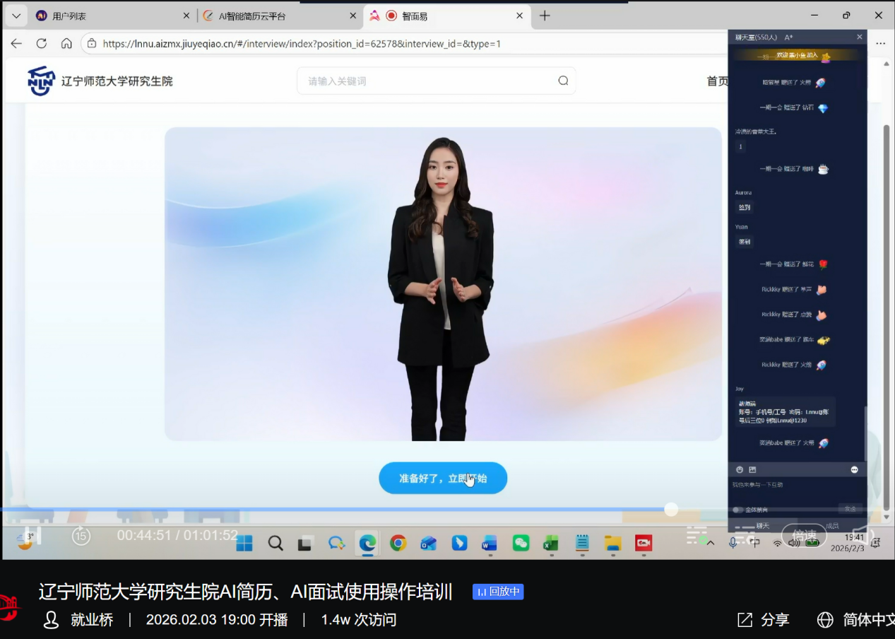 为深入贯彻教育部“寒假暖心促就业”专项行动精神,落实学校在“研究生就业服务数智化建设进展专题调研会”上的工作要求,提升研究生数智化求职应聘实战能力,促进毕业生高质量充分就业,2月3日,研究生院举办AI赋能就业平台使用操作培训会。本次培训通过就业桥平台进行直播,吸引了3578名师生参与,累计观看次数达5805次,取得了显著成效。